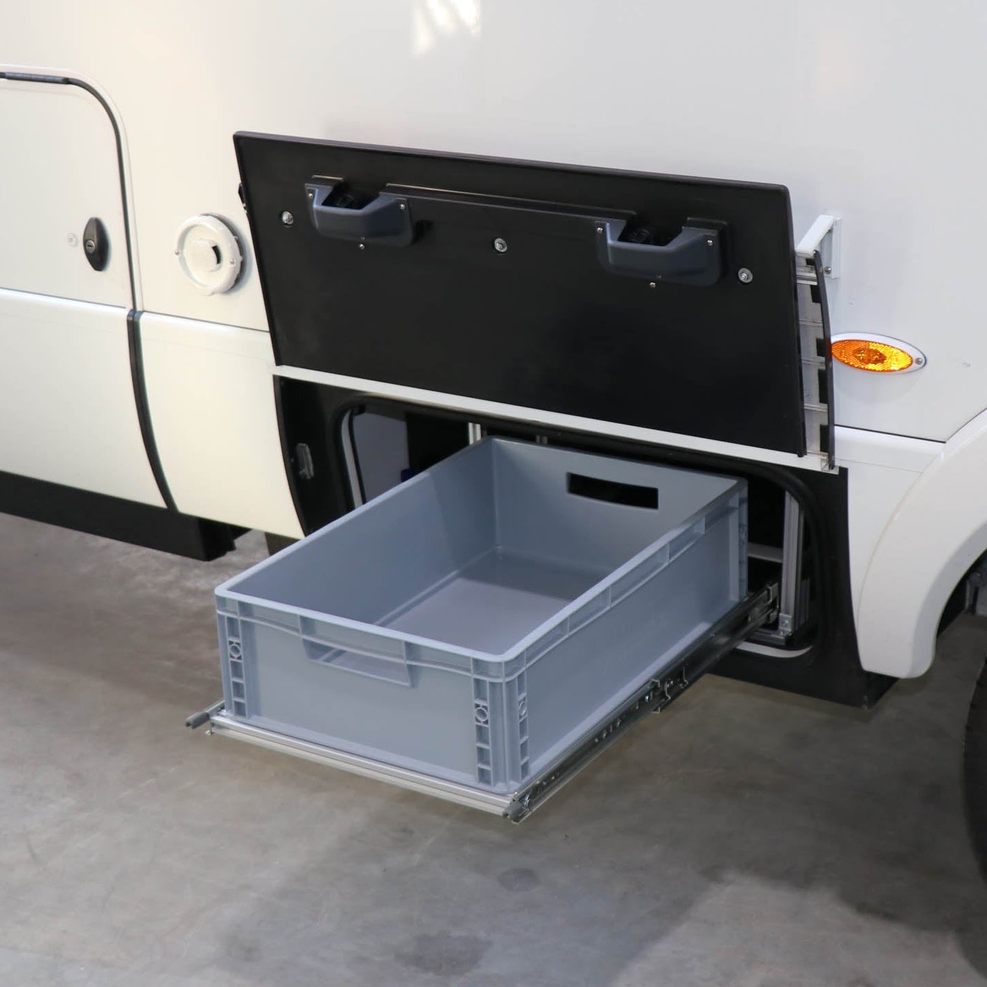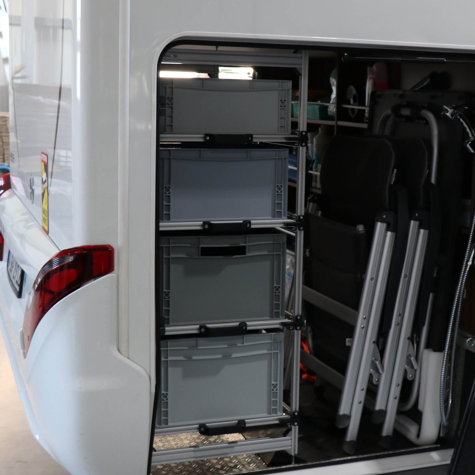 Passend uittrekbaar rek van aluminium voor de achtergarage van de Hymer B 780. Het rek wordt aan de rechterkant naar de woonruimte toe gemonteerd en biedt op vier niveaus plaats voor Euroboxen. De bovenste drie etages zijn volledig uittrekbaar en maken snelle toegang van buiten mogelijk, zonder de garage te betreden.